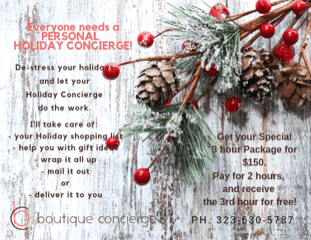Feel free to contact Boutique Concierge owner, Naima Blasco at 323-630-5787, or email. You have nothing to lose by having a personal concierge’s help, and everything to win!